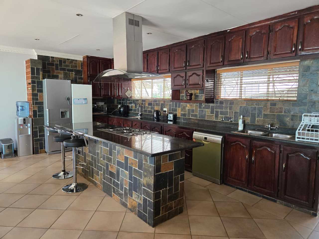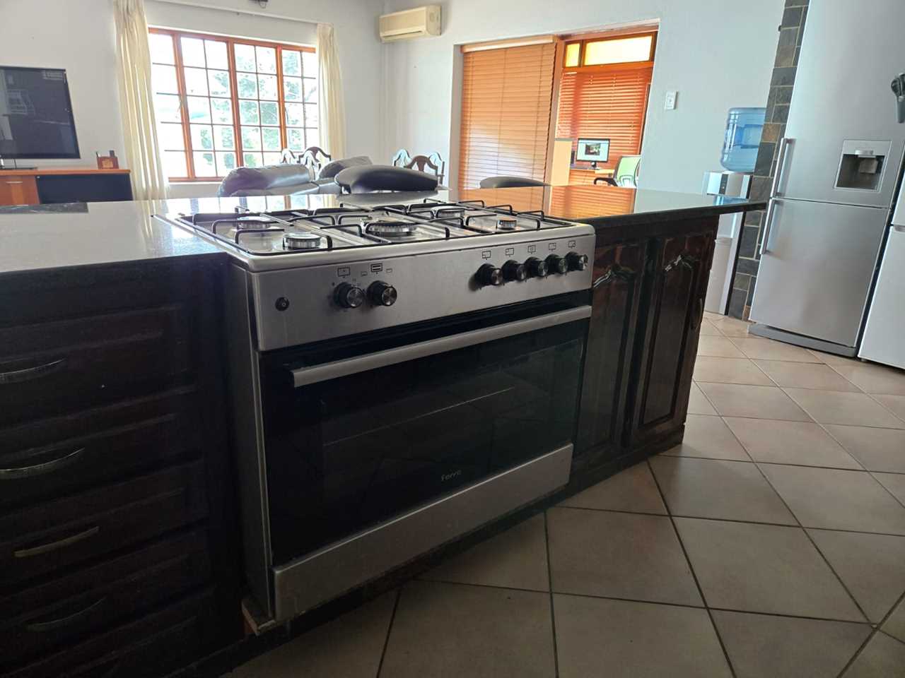 - Spacious open-plan kitchen with ample cupboards, island counter, and gas stove